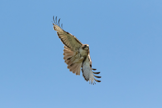 This beautiful Red-tailed Hawk was perched on a pole. The second I stopped, it flew. Hoping the bird was focused properly, I ran off a few shots. Photographing birds and wildlife is fun and challenging - they fly or run away so quickly!