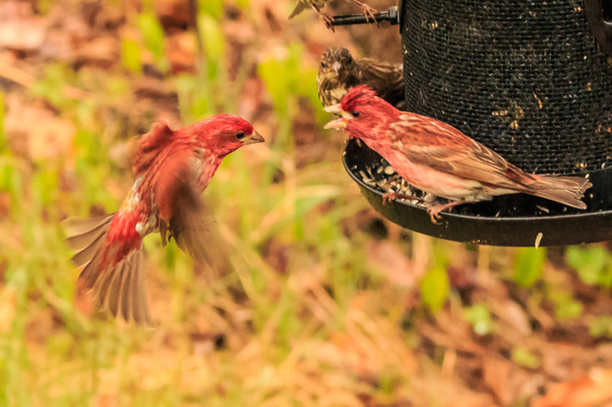 purple finch seem to be talking at the bird feeder