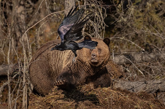 This grizzly bear was burying their fresh deer kill and doing their best to protect it from the scavenging ravens. A few flybys from the ravens prompted some close swiping claws!