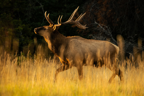 This medium sized bull Elk trots through a sunlit field of grass during the Fall rut.