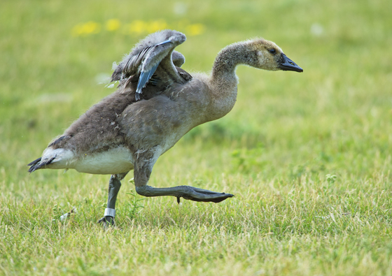 A juvenile Canada Goose just not ready to fly yet. The wings are not properly developed yet so it needs to be patient.