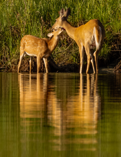 A Whitetail Doe and her fawn bond by licking each other.