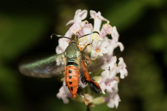 This is one of the more colourful insects we get here. I don't see them very often since no one around grows any kind of squash. When feeding (in this case on lavender flowers), they are like humingbirds, never landing.