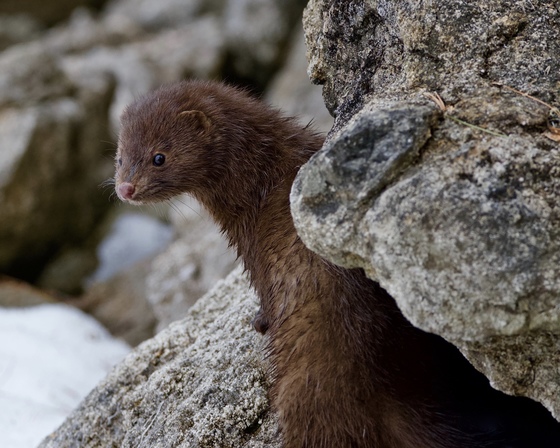 Was taking pics of trumpeter swans when this little guy crossed the ice and started coming up the shoreline towards me he got so close at one point I wasn't able to focus on him