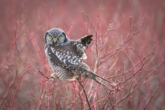 I think this Northern Hawk Owl was hoping to enjoy some fresh blueberries. Sorry, buddy. You’re too early. He filled up on voles instead.