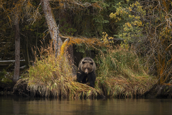 A grizzly emerges from the rainforest of British Columbia in search of protein rich salmon.