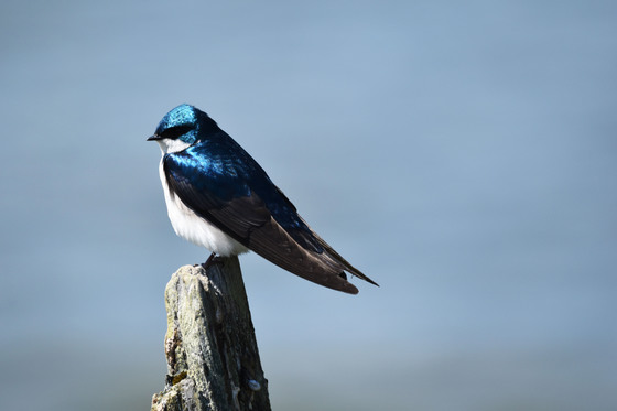 A Tree Swallow perched by a blue pond.