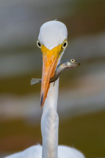 Great Egret catches a fish and both look up for the photo.