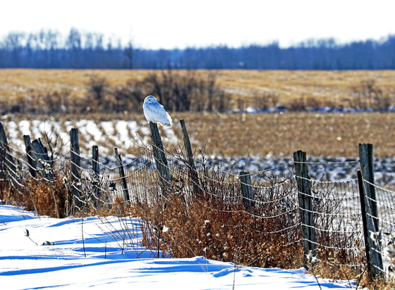 I asked my husband very nicely to spend a few hours to go for a tour on the country roads north of us to look for Snowy Owls one fine sunny winter afternoon and like the awesome husband he is, he agreed. I need a driver so I can search and he can drive and it worked well. Imagine my delight when the regal Snowy Owl was found perched on a fence post in a farmers field. The Snowy Owl is a sit and wait hunter. Silent and patient it surveys the winter corn field as it hunts during the day, unlike other Owls. There haven't been too many sightings of the Snowy this winter so actually spotting this Arctic beauty between Fergus and Arthur Ontario Canada was thrilling!