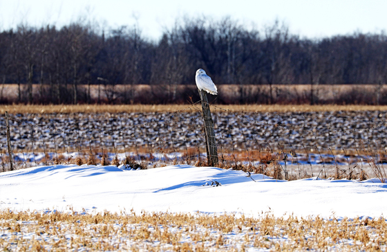 I asked my husband very nicely to spend a few hours to go for a tour on the country roads north of us to look for Snowy Owls one fine sunny winter afternoon and like the awesome husband he is, he agreed. I need a driver so I can search and he can drive and it worked well. Imagine my delight when the regal Snowy Owl was found perched on a fence post in a farmers field. The Snowy Owl is a sit and wait hunter. Silent and patient it surveys the winter corn field as it hunts during the day, unlike other Owls. There haven't been too many sightings of the Snowy this winter so actually spotting this Arctic beauty between Fergus and Arthur Ontario Canada was thrilling!