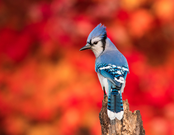A blue jay poses momentarily with red maples at peak colour which provided a vivid autumn background.
