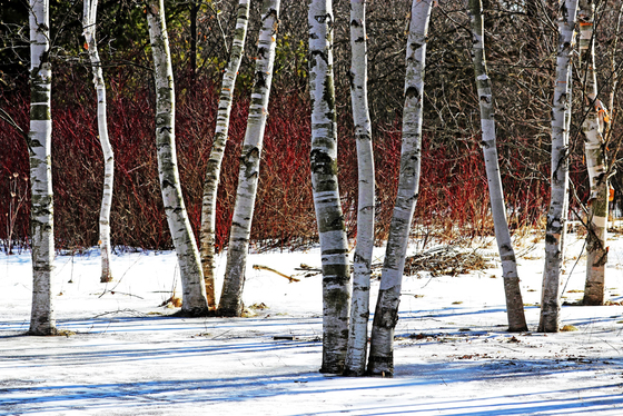 The white bark of the Birch trees is actually enhanced by the white snow in this open woods setting in Guelph Ontario Canada and the red stems of the Dogwood really add a pop of color to the winter landscape.The morning sun casts lovely shadows on the fresh snow and made this one glorious morning for a cold winter walk.