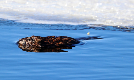 Ice on the roadside pond in Guelph Ontario was starting melt and the Muskrats were out and about