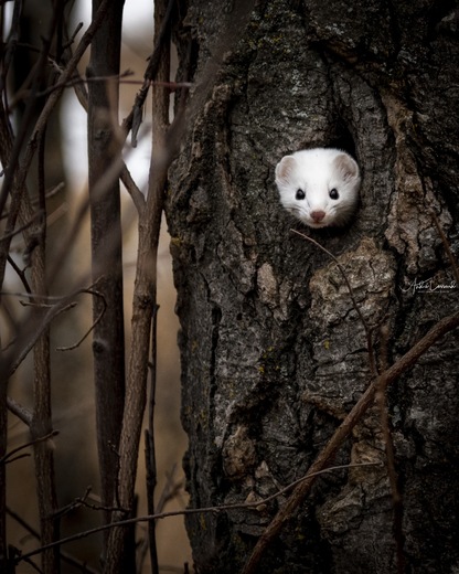 I was on a hike in Elk Island National Park. I was there to capture the landscape and any wildlife I encountered along the way. After 20km hiking and only seeing chickadees, I was surprised by this white little head sticking out of the tree looking at me. This little white weasel was the perfect encounter.