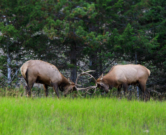 In Jasper National Park, two bull elk fight for dominance during the rut.