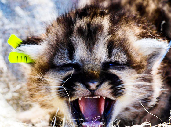Taken in Alberta, Canada, this 5 week old mountain lion kitten shows off its teeth with a big roar.