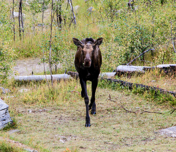 Young female moose walks through the grass in Jasper National Park, Alberta.
