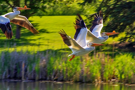 This was taken when a group of pelicans were just starting to fly away from a park lake in Edmonton.