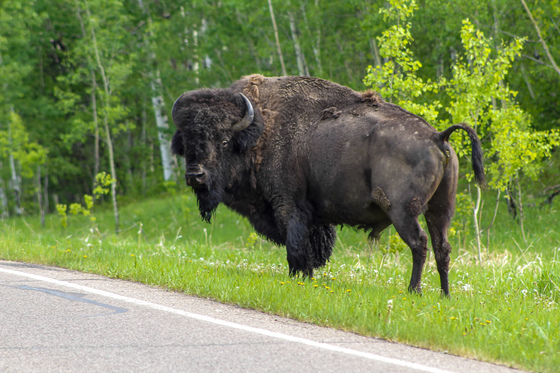 While out driving around Elk Island, this lone bison was standing at the side of the road eating grass and grazing, providing the perfect picture opportunity.