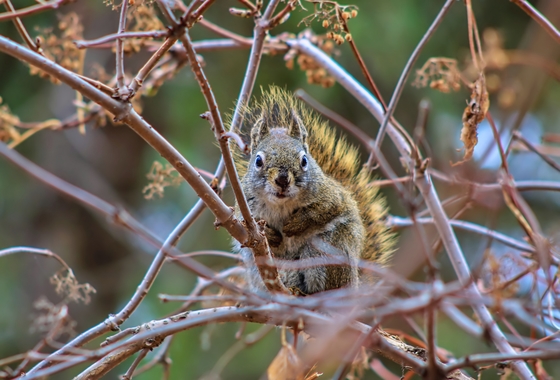 A close up view of a squirrel sitting in a tree at an Edmonton park.