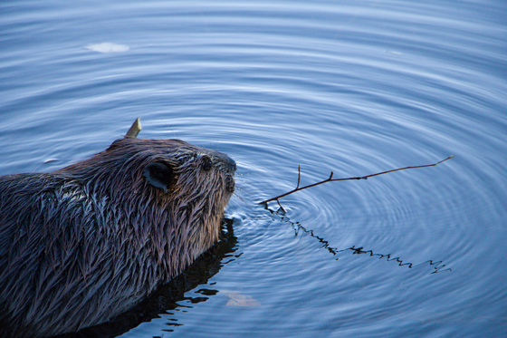 The hard working beaver strips the branch of leaves and bark, before carefully placing it among other branches which form its constructed lodge.