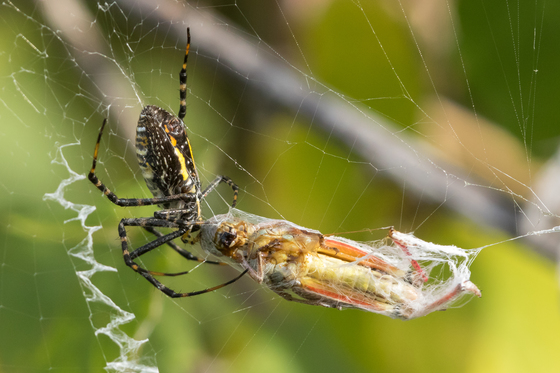 A Banded Garden Spider wraps up a meal.