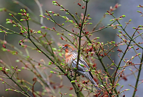 This attractive male House Finch perched in the branches of the Burning Bush in spring is sporting some strange colors. He is a mix of red, yellow and orange. The House Finches acquire their coloration from pigments in the plant foods they eat. This is true for most birds with red, orange, or yellow-pigmented feathers. These tones each derive from a different organic pigment, known as carotenoids. I had never seen a male House Finch with these colors and I think that I like this color combination better than the red!