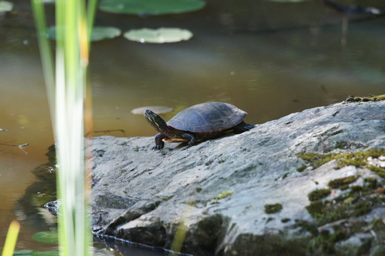 A calm little pond. A big boulder in the middle. This is perfect life for a happy turtle.