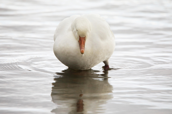 A Snow Goose and reflection of her head in water. Photo taken at Réservoir Baudet Victoriaville P.Q
