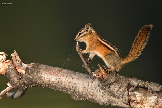 I got this shot while waiting on a log for about an hour. When suddenly this chipmunk hopped out of the Bush’s and went onto the branch over the lake to get a drink as it climbed over this log I managed to capture him just as he was walking over this stick in his way.