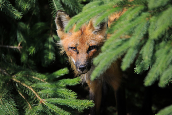 A red fox hidding in the forrest. Photo taken at Cap Tourmente P.Q