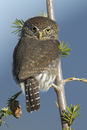A northern pygmy owl hunts from a small spruce tree.