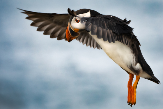 Damp and overcast day but the contrast is interesting. Beautiful Atlantic Puffin coming in for a landing.