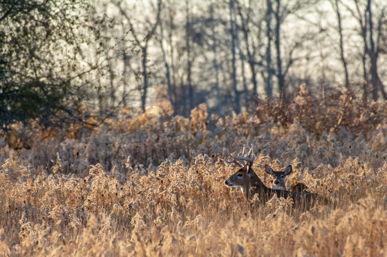 While out taking some photos of birds at my local conservation area, the sun was starting to set when I noticed the handsome White-tailed buck and doe out in the farmers field.