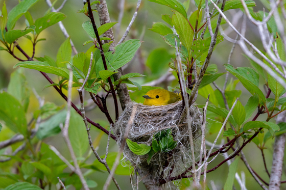 In May, hundreds of warblers migrate through the Durham region. While walking in the meadow of my local conservation area, a Yellow Warbler flew past me and directly onto her nest. As not to stress the mother to be I quickly took a few shots and moved on.