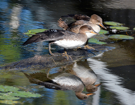 Enjoying the early sunshine, the young merganser gave a morning stretch of its wing.