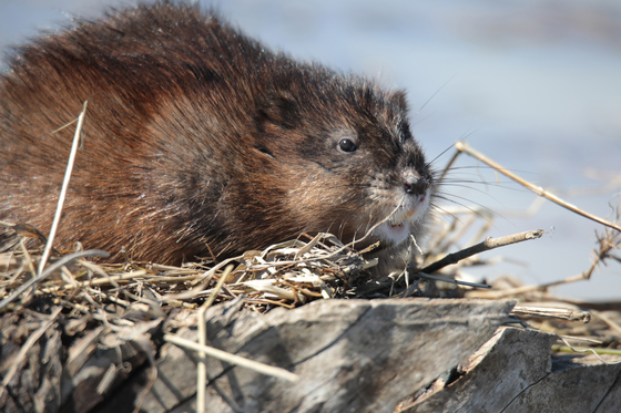A Muskrat resting on dead wood floating on the lake