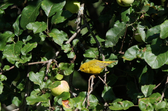 A female yellow warbler is wandering at an apple. Not edible of course... but the worm inside is quite a meal