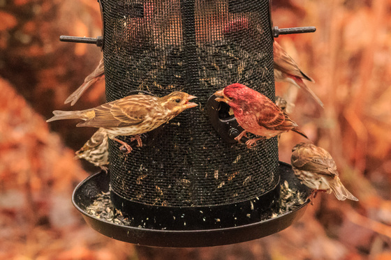 Male and female purple finch have a chat at the bird feeder