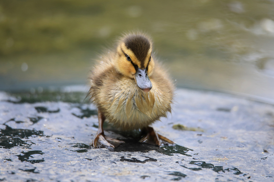 A baby Mallard duck getting out of the pond and standing on a rock.