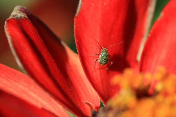 A tiny green insect makes good contrast with red petals. Photo taken at a Botanical garden