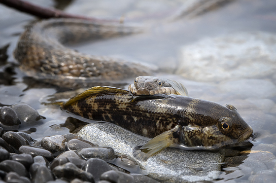 A Northern Water Snake has caught and is about to swallow a Mottled Sculpin, a fish that looks much to big for the size of the snake.