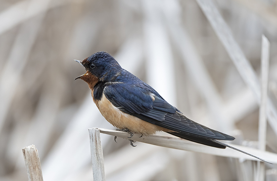 Barn swallow calling out while perched on marsh reeds.