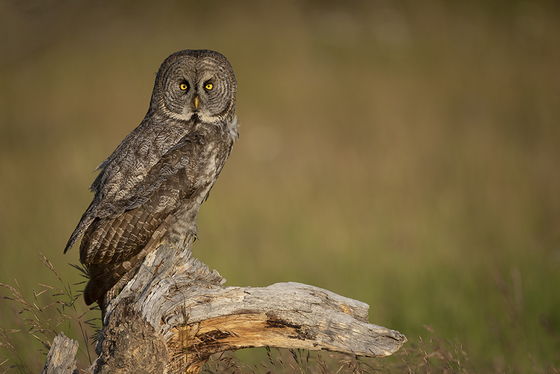 This male great gray owl likes to use this very photogenic perch to hunt from.