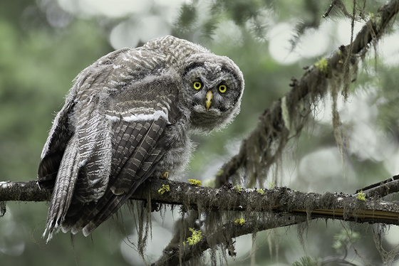 A curious great gray fledgling seems interested in the clumsy human trying to maneuver the bushes.