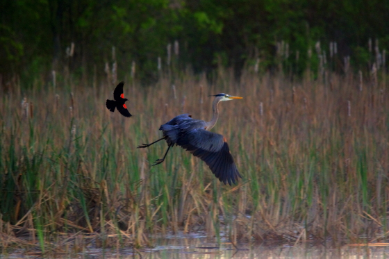 This Blue Huron is on the move from that small black bird. A real issue for these big birds.