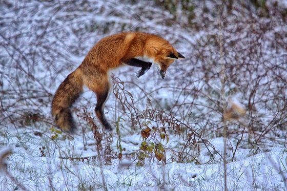 This fox is have his first winter in the bush. He sees and mouse moving under the snow and he is trying to stop it. He did