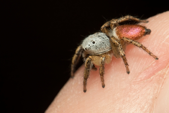 My favourite jumping spider, Habronattus decorus, on my finger. One of the more colourful spiders in this area.