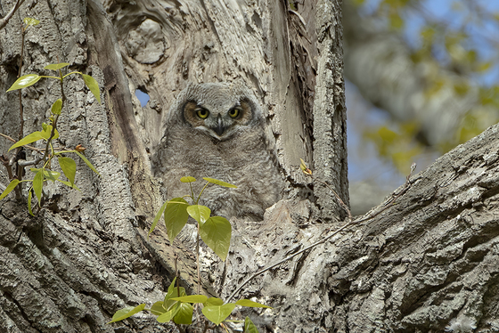 The Great Horned Owlet isn't easy to find as it blends into the nest tree.