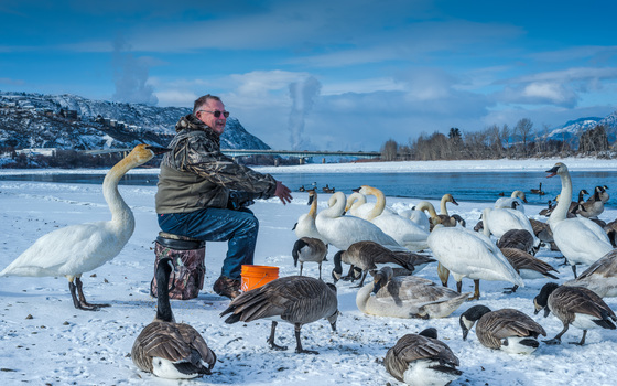 Recognized by local waterfowl, an outdoor enthusiast feeds the birds on the shore of North Thompson River.